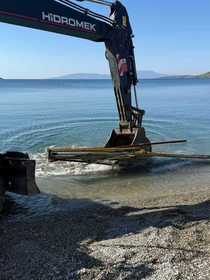 İlçede son yaşanan fırtına ile denize uçan şemsiye şezlong gibi malzemeler de kıyı ve denizden alınarak temizlendi.