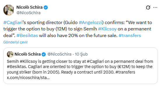 Schira, haberinde Semih Kılıçsoy’un bonservisini Beşiktaş’tan almak isteyen Cagliari’nin ödeyeceği bedelin 12 milyon euro olduğunu belirtirken ayrıca Beşiktaş’ın sonraki satıştan %20 payının olduğunu da vurguladı.